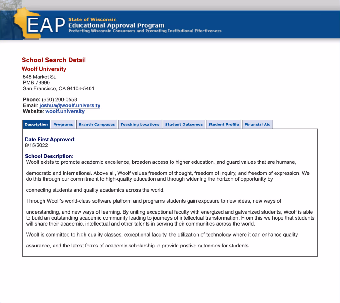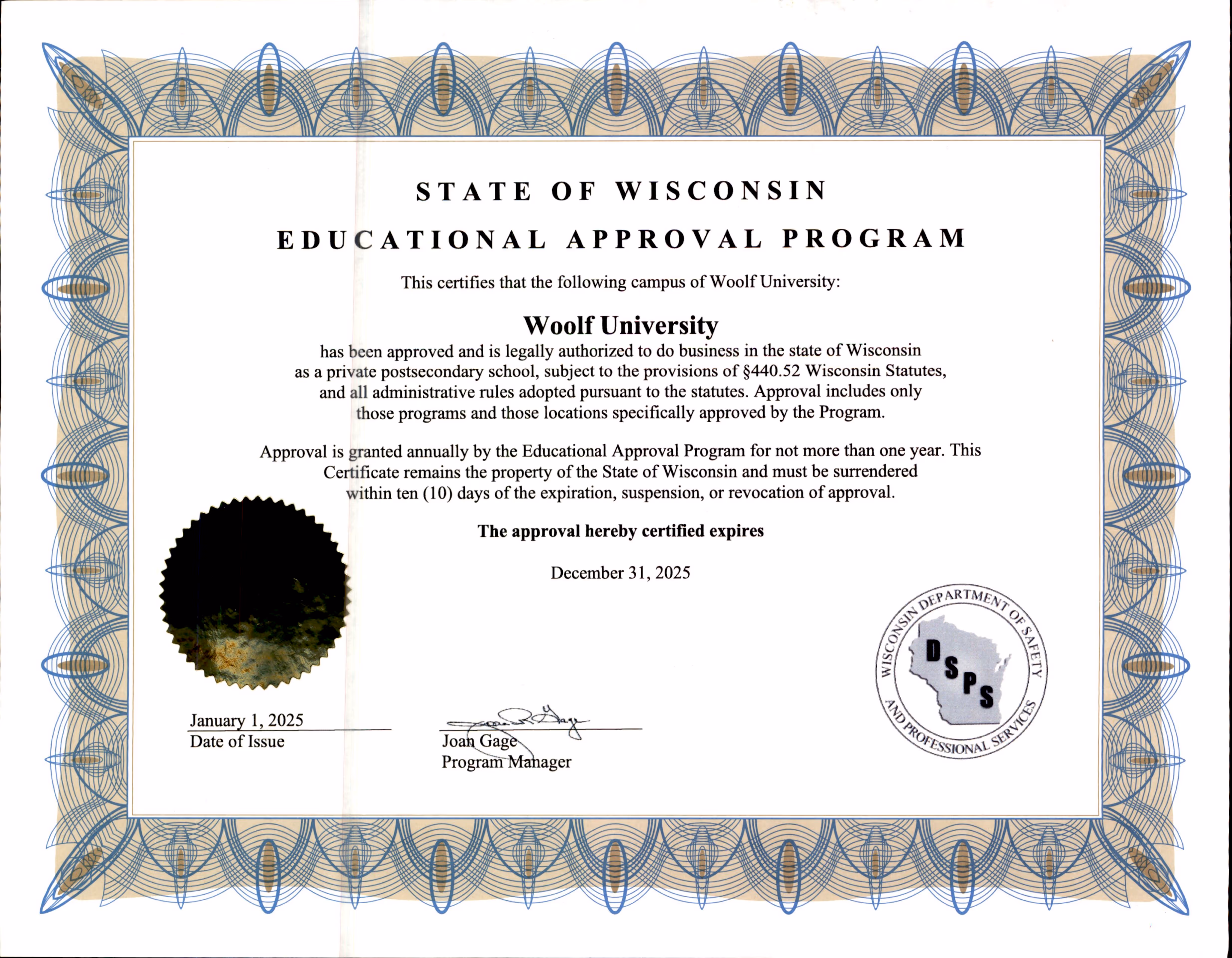 Woolf University is incorporated and officially approved in the State of Wisconsin under Wis. Stats. § 440.52 (10)(a), with approval granted on August 15th, 2022 under the Educational Approval Program of the Wisconsin Department of Safety and Professional Services, which is the body providing state licensure for universities. State approval is not the same as "accreditation."